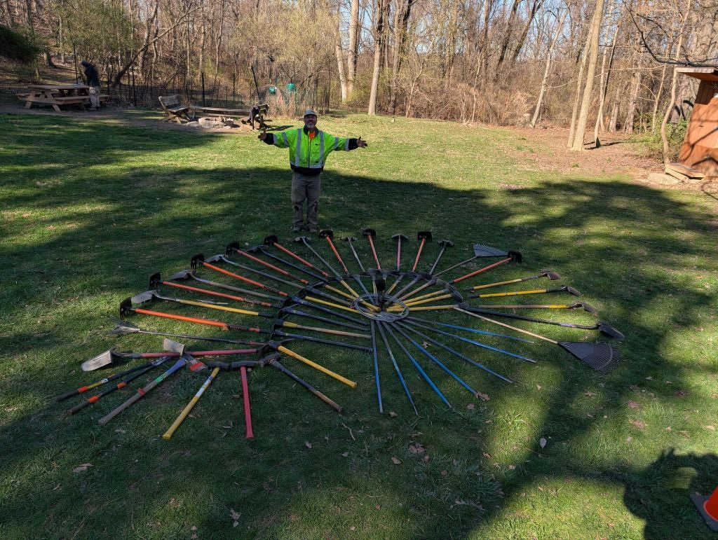 This is trail maintenance tool art on a recent Cadillac crew work trip at Bear’s Den hostel near Bluemont, VA
